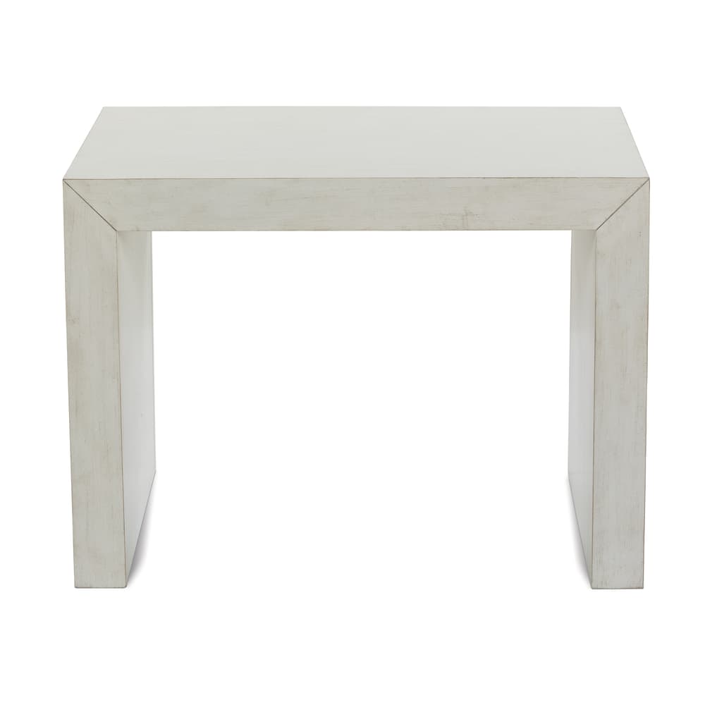 The Passage Rectangle end table features a Resin rubberwood solids in a Oyster finish with adjustable floor glides and Gesso textured top.